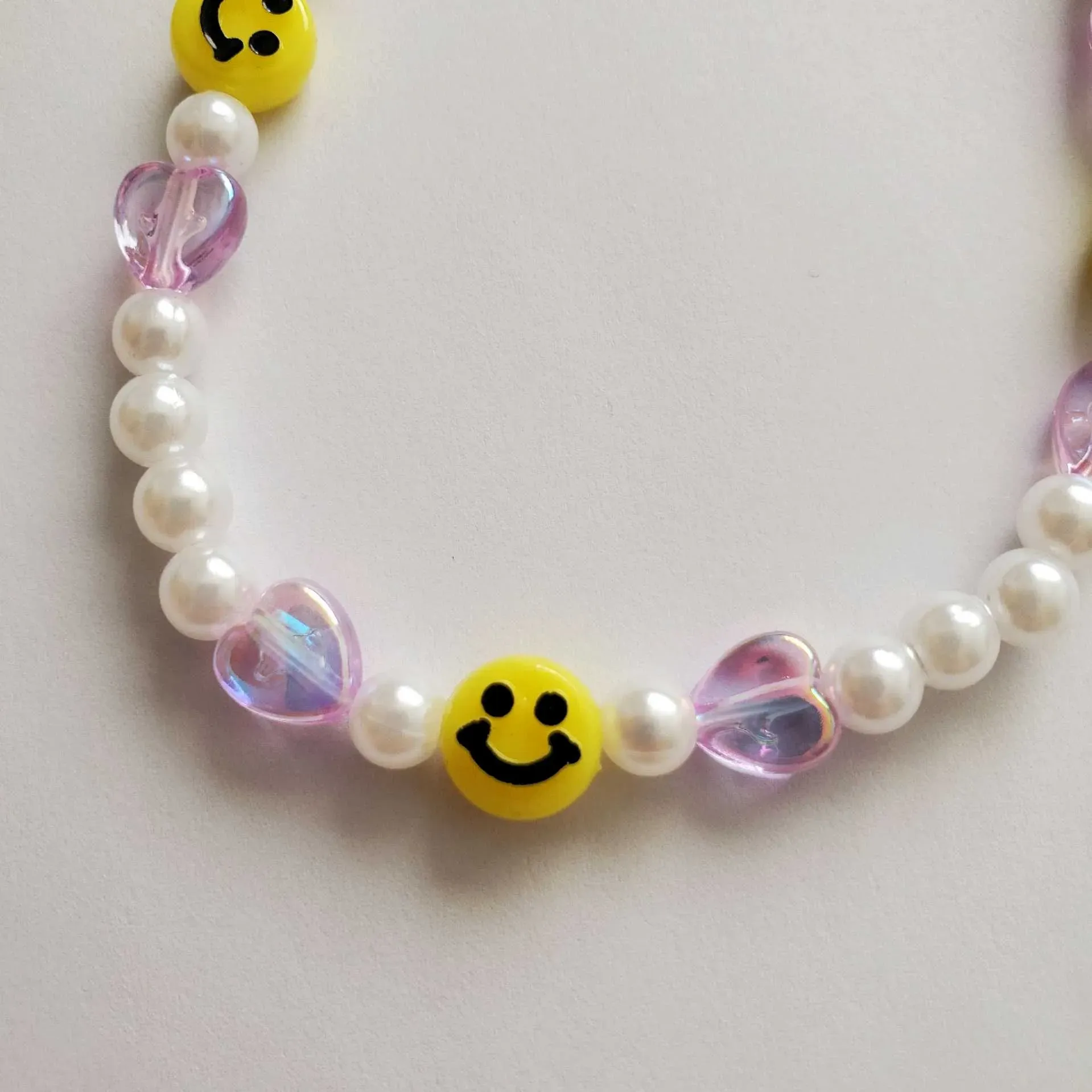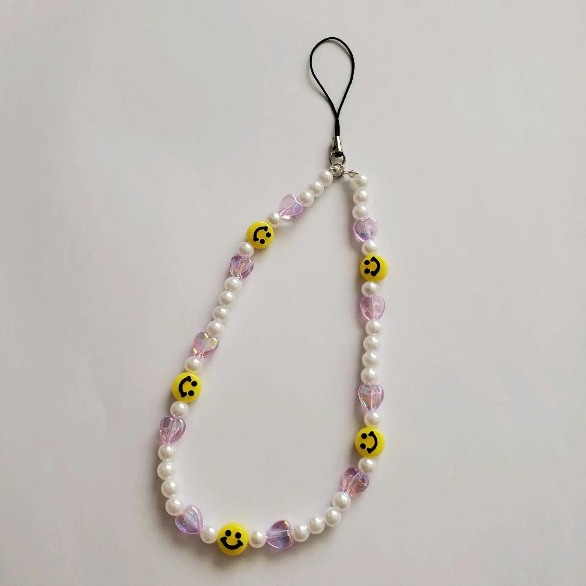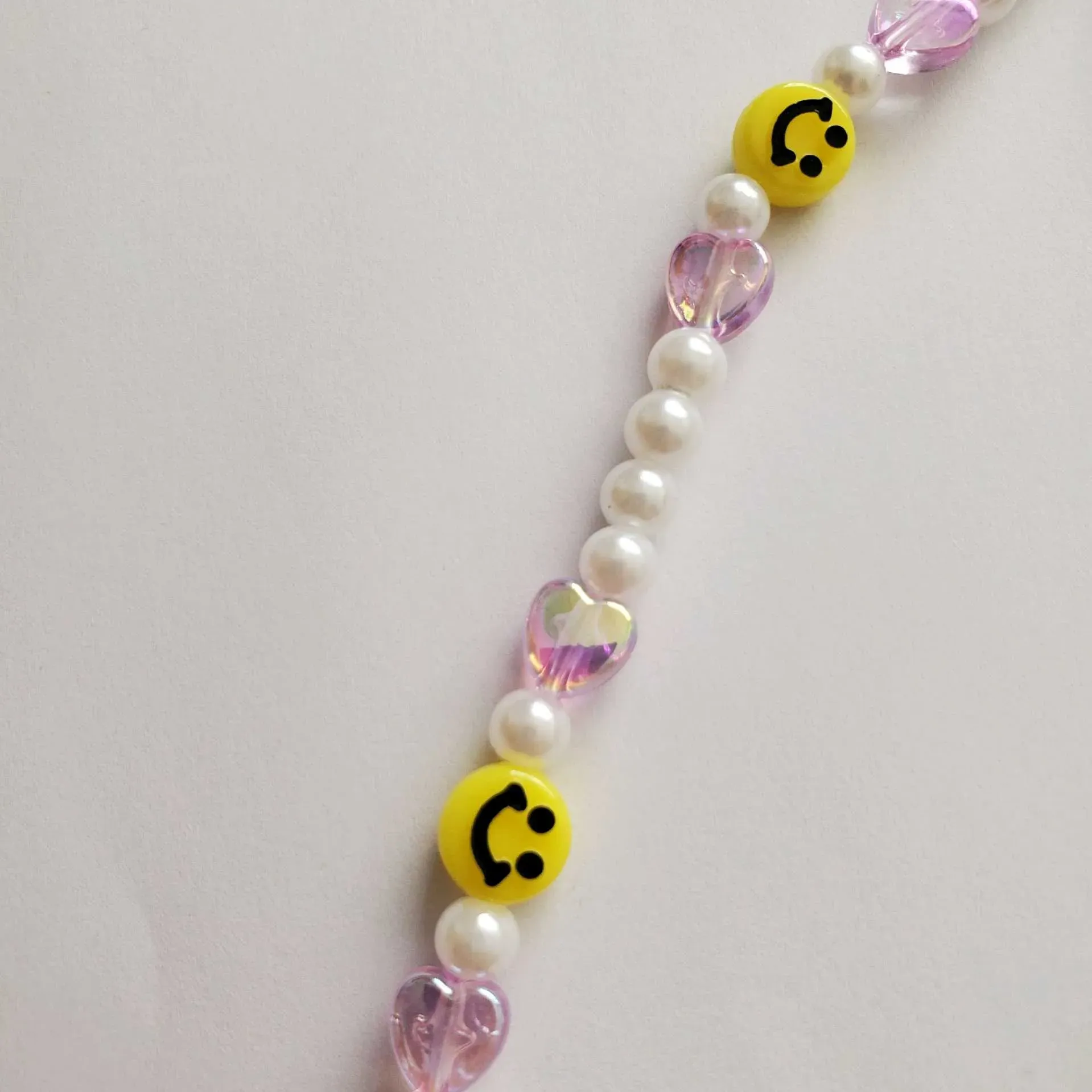 🎀Precioso phone strap largo inpirado en caritas happys con corazones, contiene perlas blancas dijes de corazones y caritas felices creando un accesorio único y realmente hermoso✨️