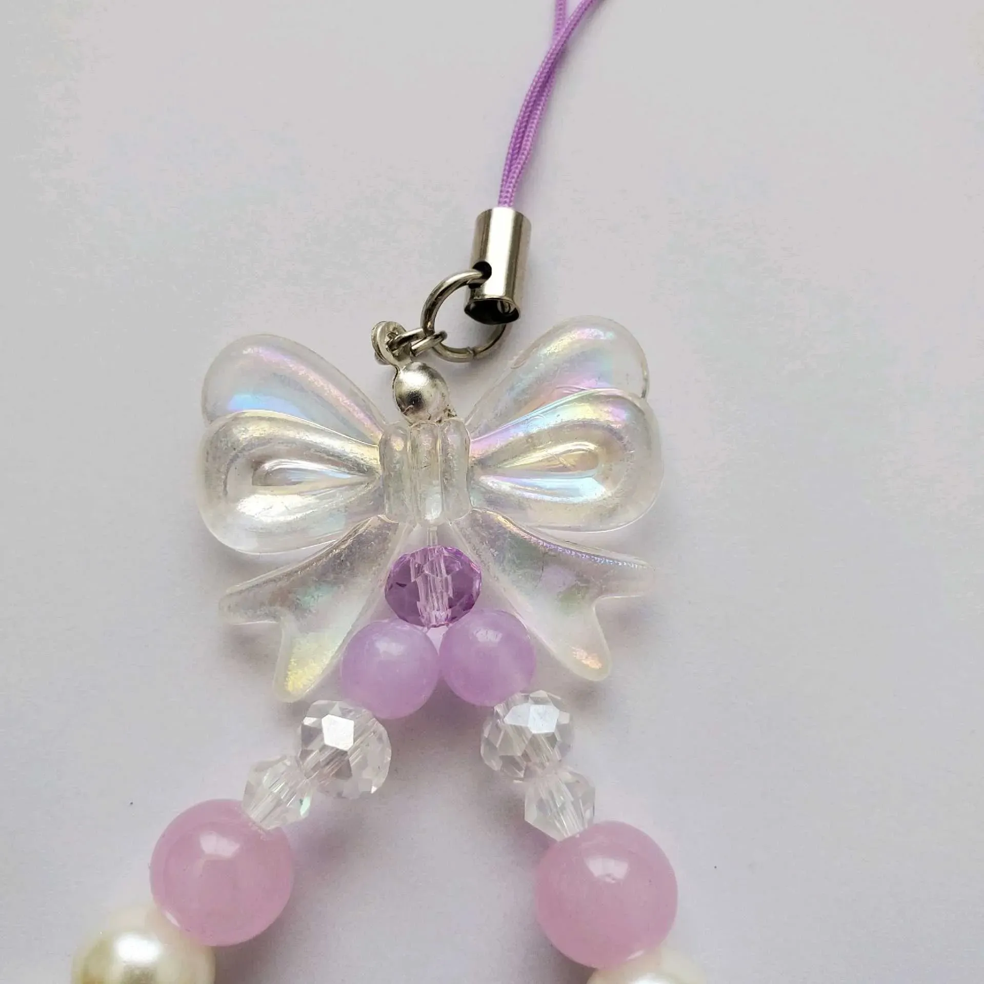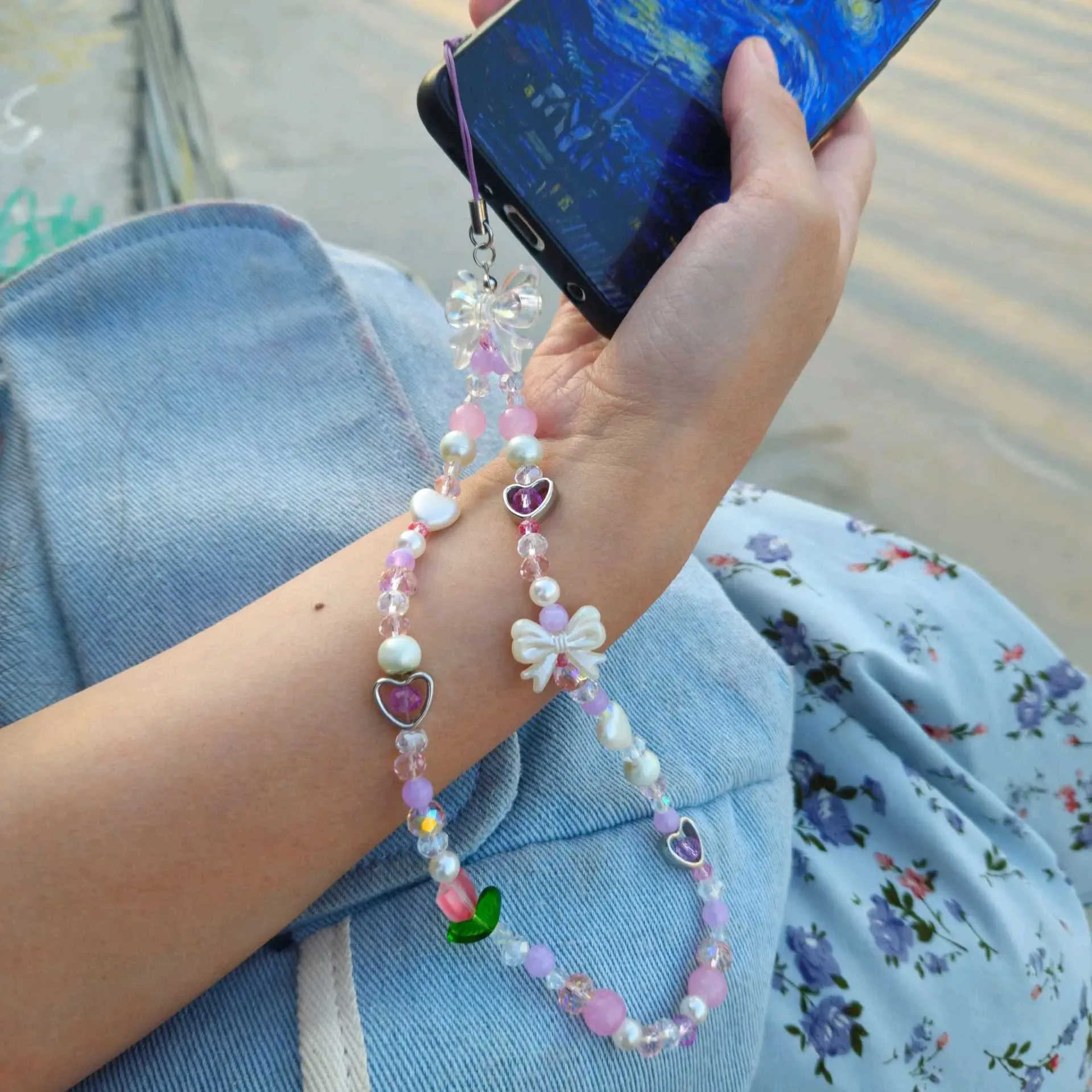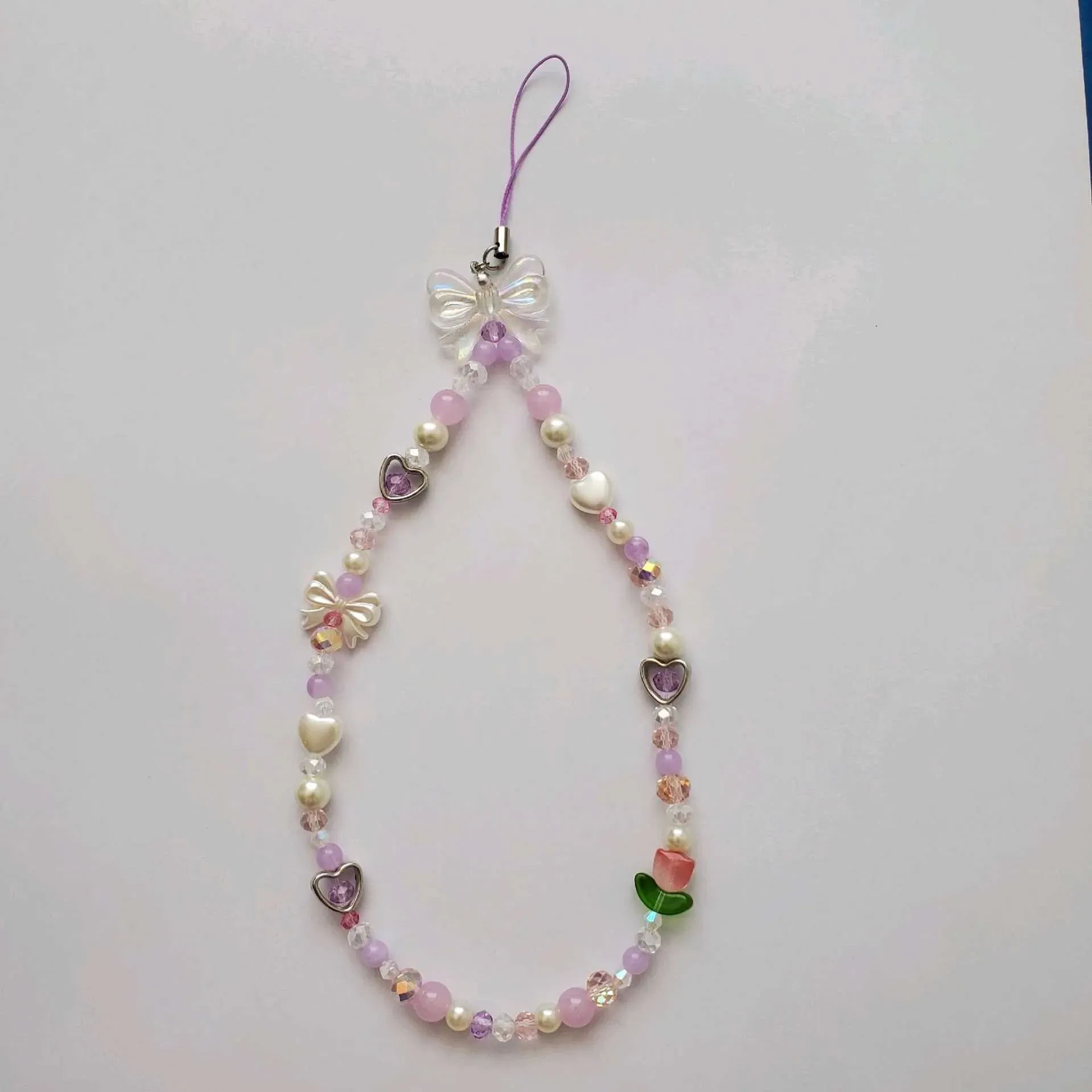 🎀Precioso phone strap largo, contiene perlas de vidrio en tono rosa y blanco, además de cristales en tonos rosas, moradas y blancas, ademas de dijes de corazon, tulipán y una cinta blanca combinada con una cinta transparente al medio creando un accesorio único y realmente hermoso✨️