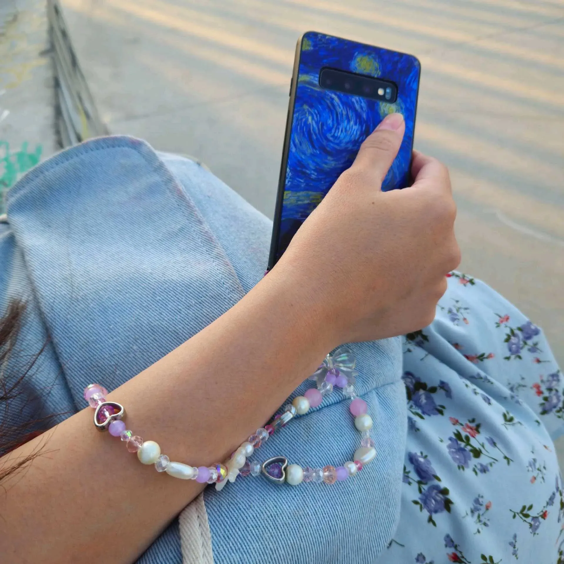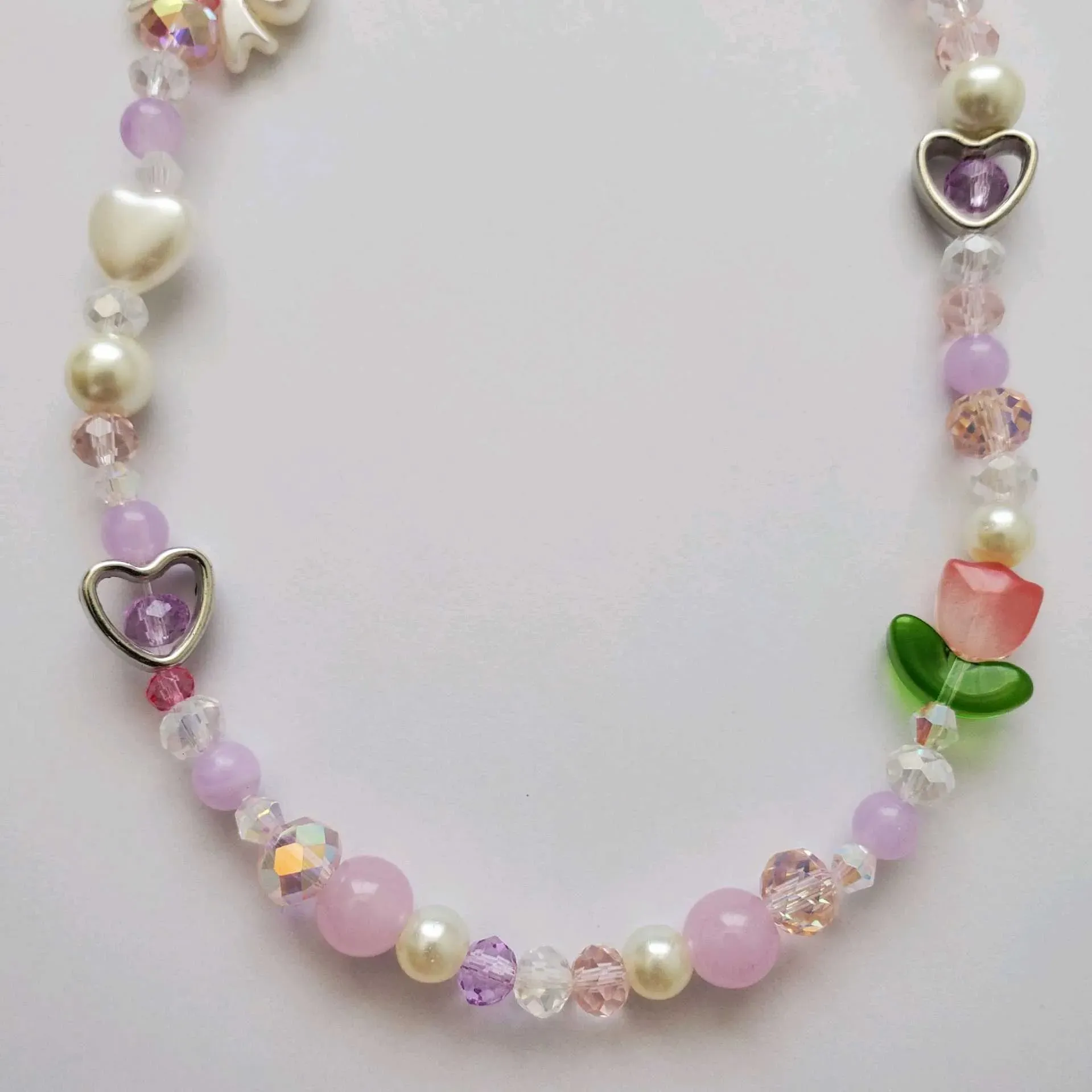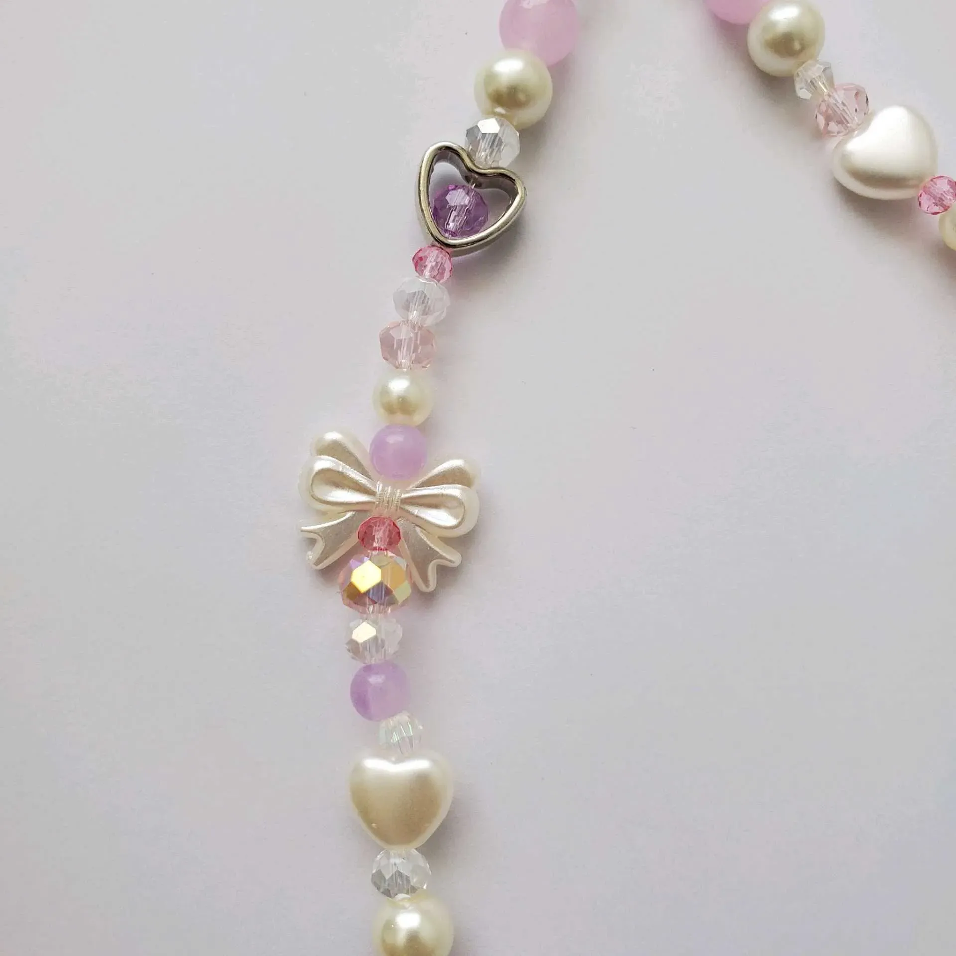 🎀Precioso phone strap largo, contiene perlas de vidrio en tono rosa y blanco, además de cristales en tonos rosas, moradas y blancas, ademas de dijes de corazon, tulipán y una cinta blanca combinada con una cinta transparente al medio creando un accesorio único y realmente hermoso✨️