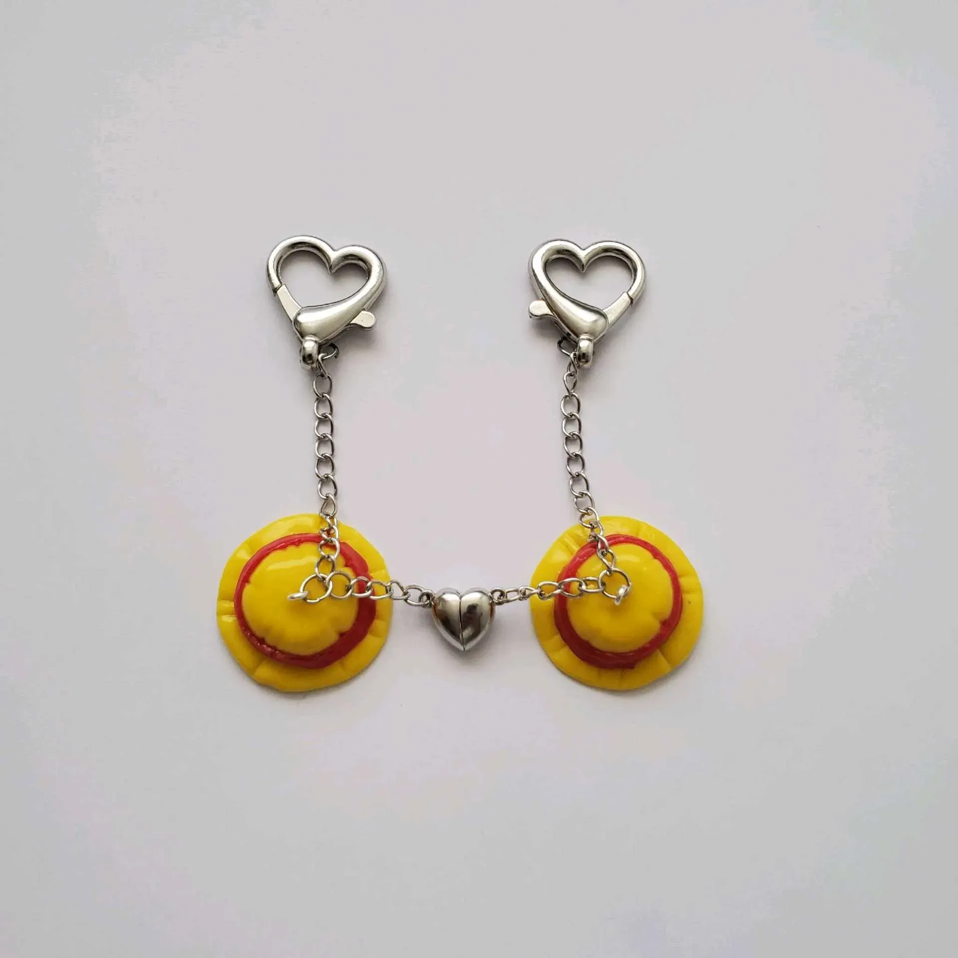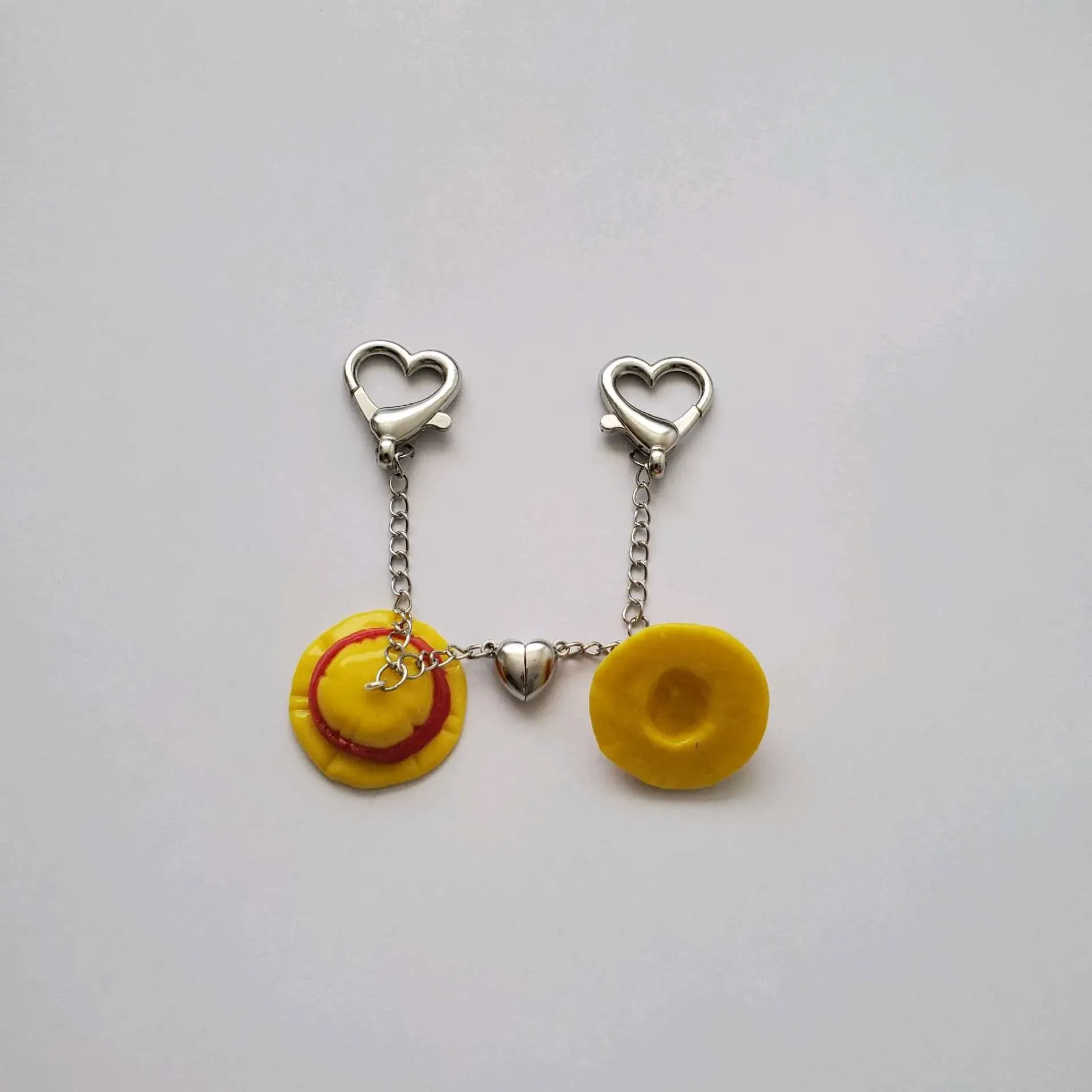 ✨️Preciosos llaveros de sombrero de paja, Luffy, personaje de One Piece, perfectos para compartir con ese alguien especial💘 contiene dijes del sombrero de Luffy, creados con porcelana fría, combinados con imanes de corazón creando un accesorio único y realmente hermoso💗