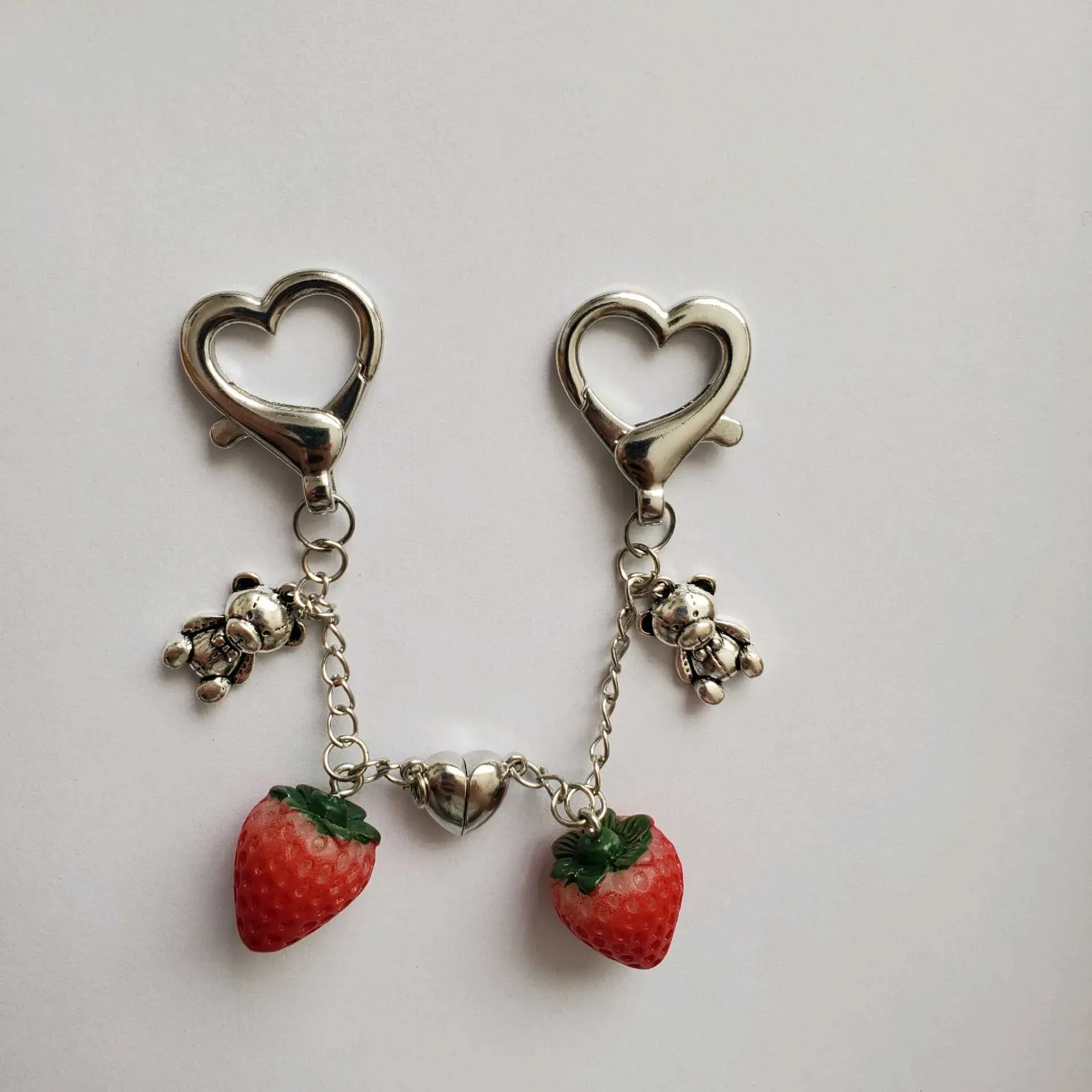 ✨️Preciosos llaveros de frutillas🍓, perfectos para compartir con ese alguien especial💘 contiene dijes de frutilla y ositos combinados con imanes de corazón creando un accesorio único y realmente hermoso💗