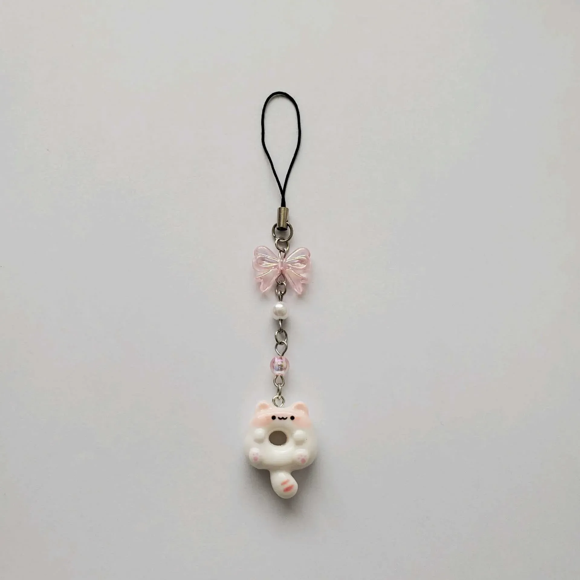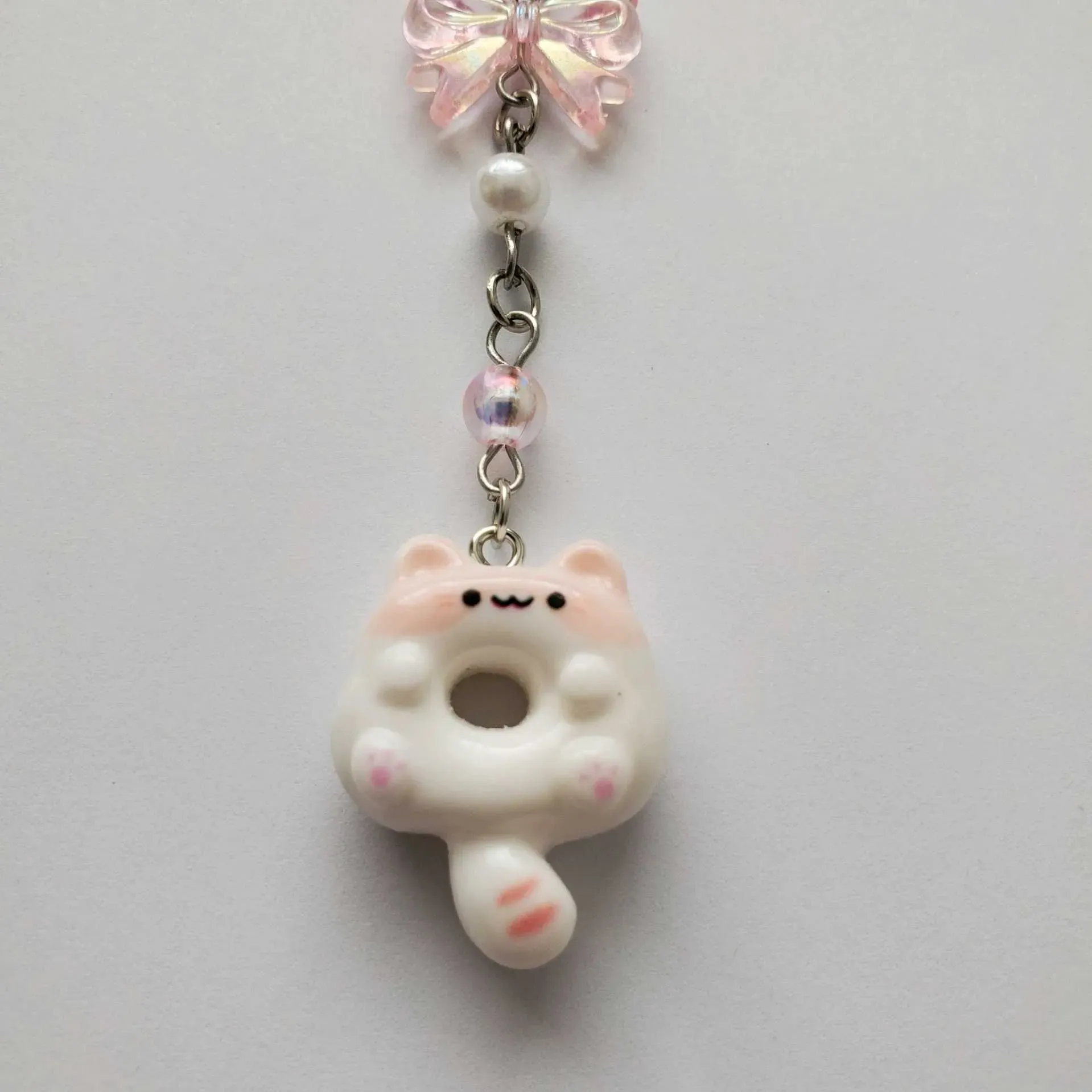 ✨️Precioso phone strap de gato dona🐱, contiene perlas de colores blancos y rosa, combinado con un dije de cinta, creando un accesorio único y realmente hermoso💗