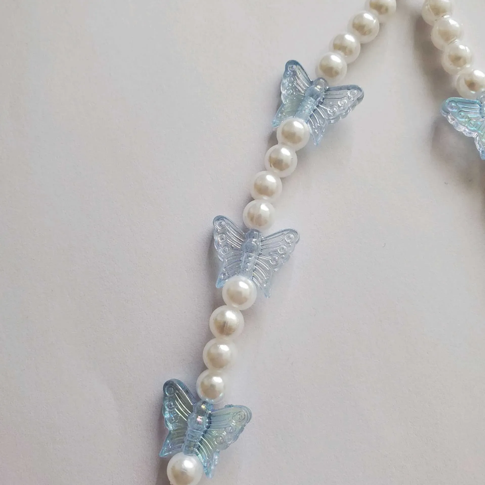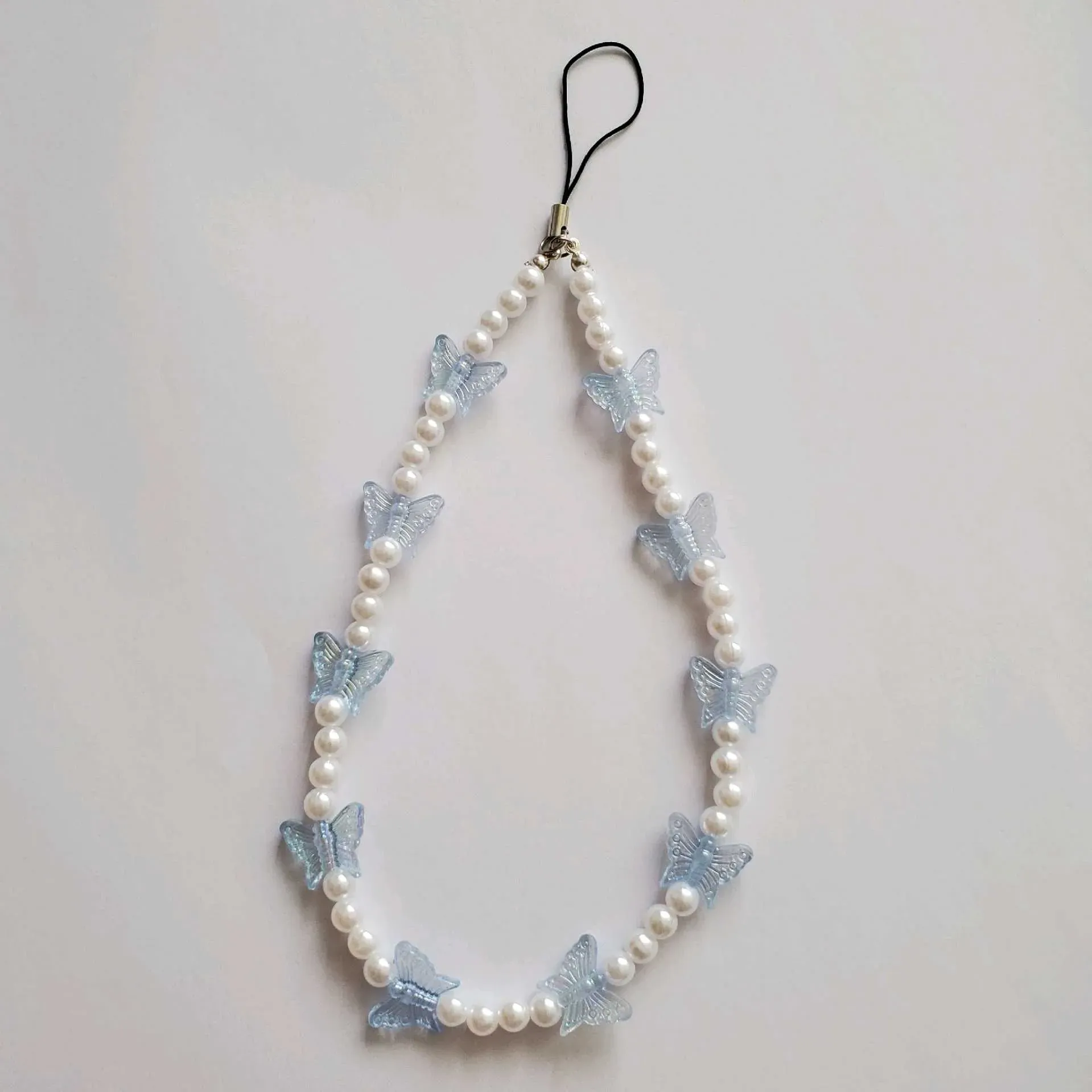 🎀Precioso phone strap largo, contiene perlas blancas combinadas con dijes de mariposas celestes creando un accesorio único y realmente hermoso✨️