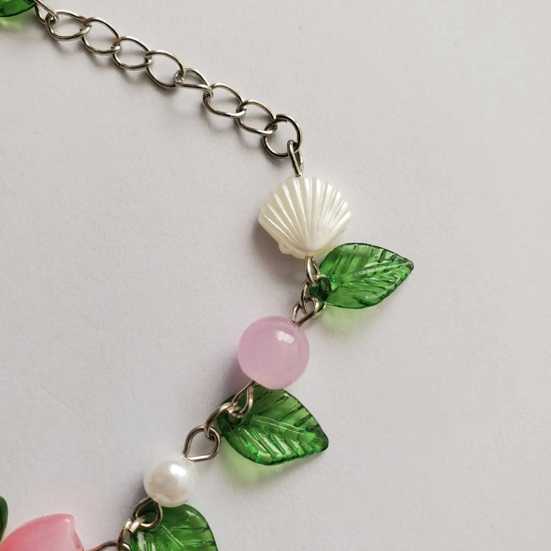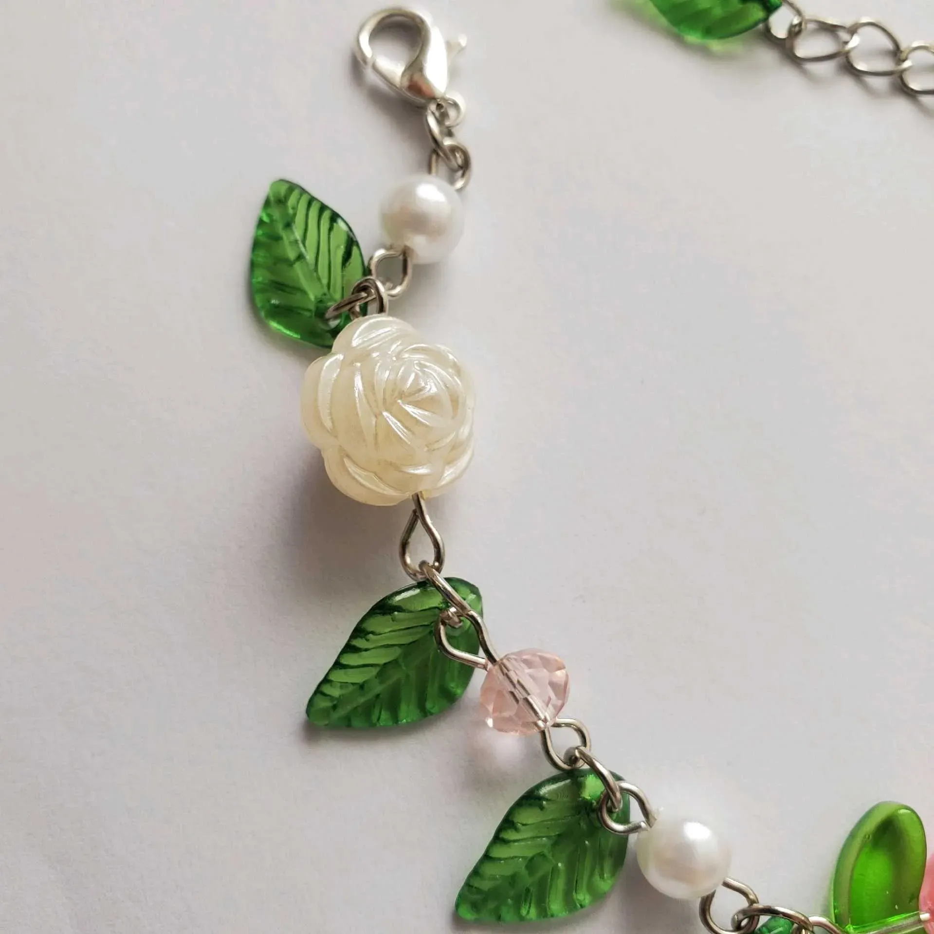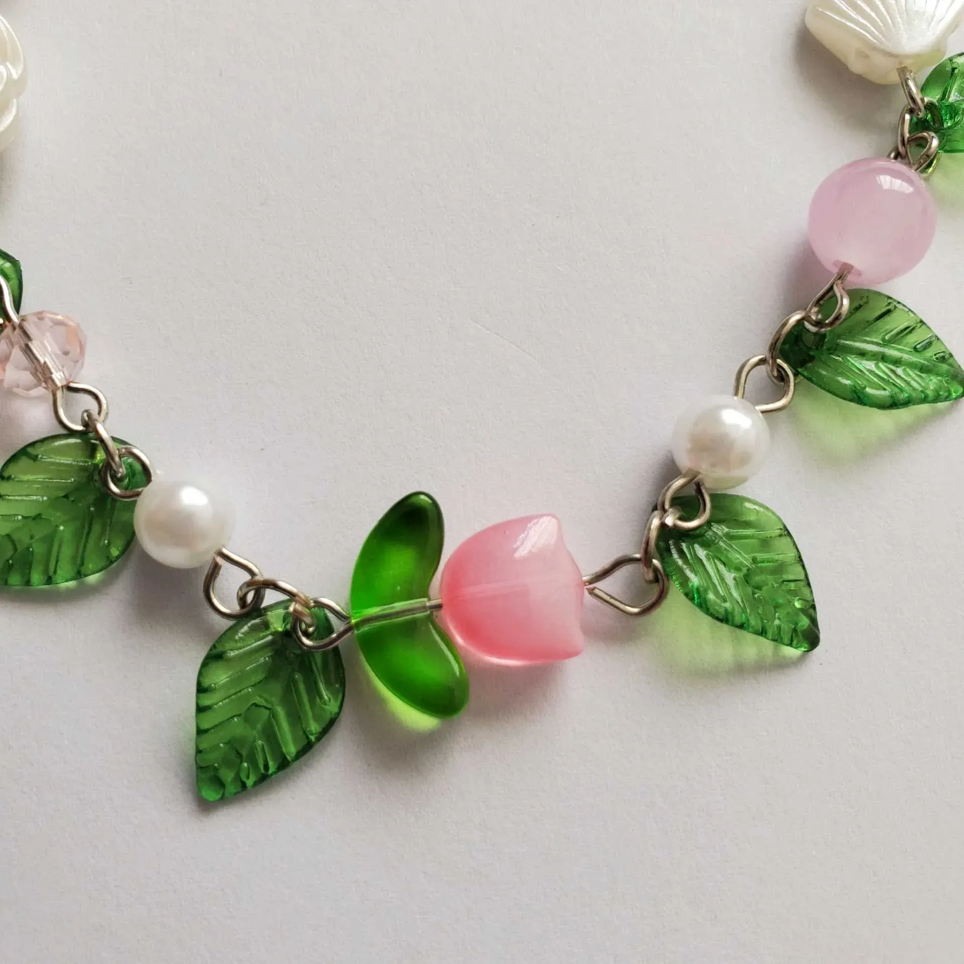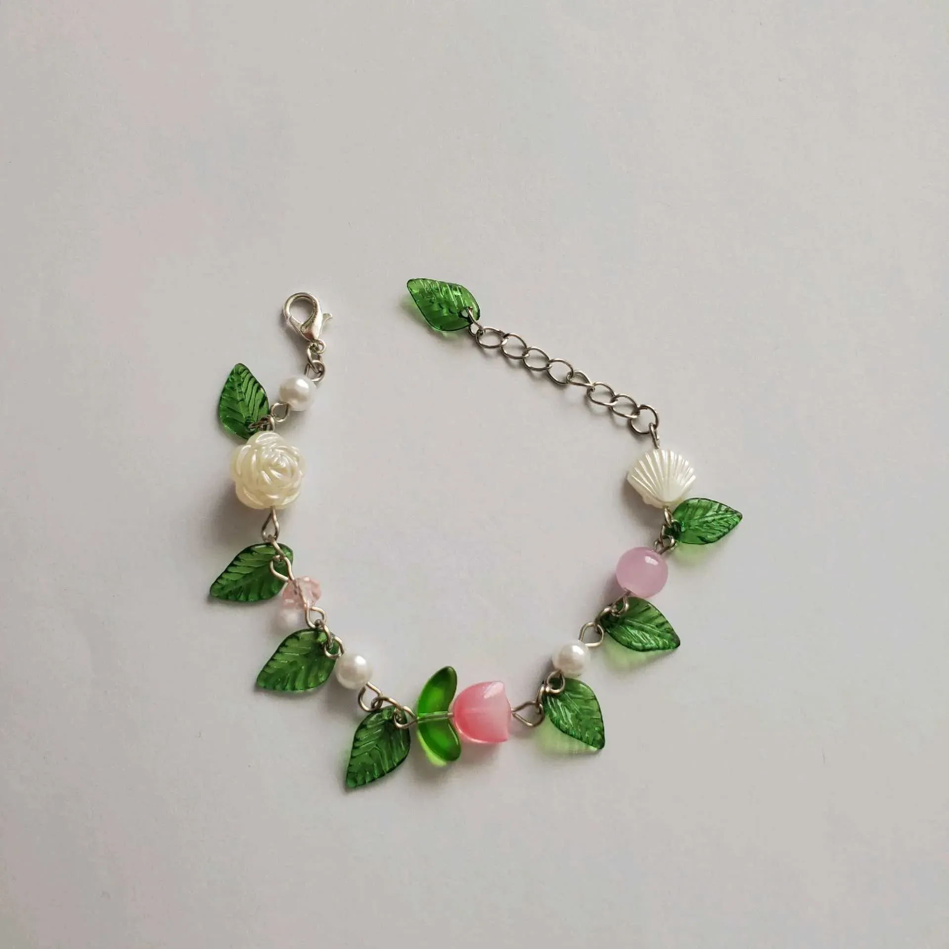 🧚♀️Preciosa pulsera combinada con dijes como tulipán, hojitas, flor y perlas blancas y rosas, luce realmente hermosa💗.