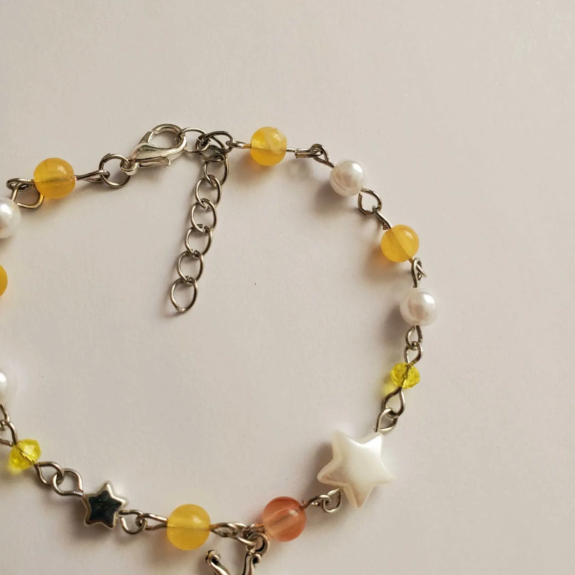🌞Preciosa pulsera de sol combinada con perlas blancas y amarillas combinada con dijes de estrella y sol, luce realmente hermosa💖.
